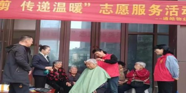 在一系列活動中,通皓物業特別設立了“助老便民服務 站” ,提供免費理發與血壓測量服務,踐行“老有所暖”服 務理念。