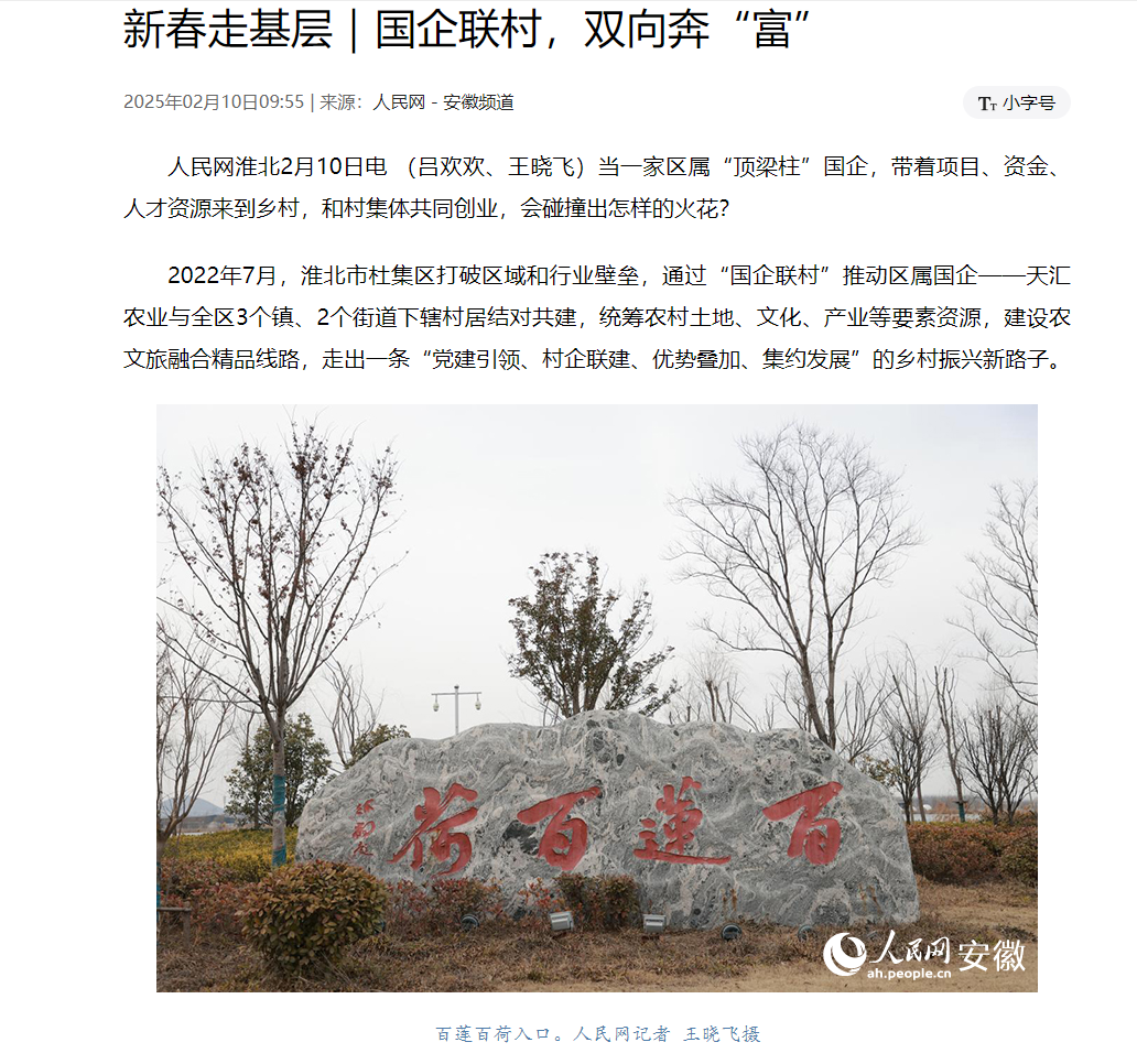 12 02月2025 了解詳情 《天匯農業:新春受贊,新年連獲佳績》 在杜集區的鄉村振興實踐中,在集團公司的戰略引領與資源支持下,與鄉村緊密攜手,天匯農業與全區3個鎮、2個街道下轄村居結對共建,統籌農村土地、文化、產業等要素資源,建設農文旅融合精品線路,走出了一條獨具特色的發展之路, 近日,人民網在新春走基層系列報道中,聚焦淮北市杜集區的“國企聯村”模式,對淮北市天匯農業發展有限公司進行了重點報道。